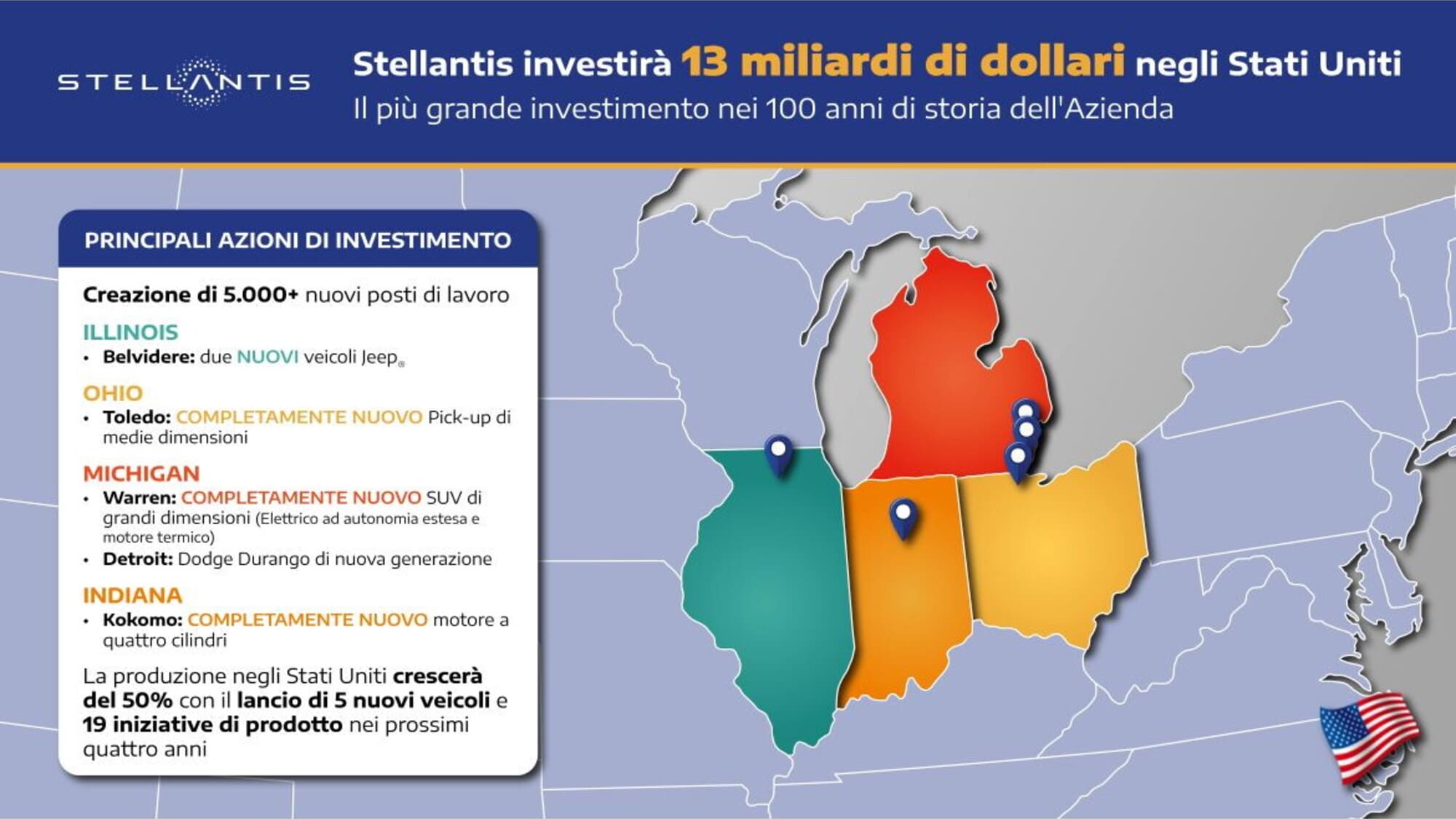 Tredici miliardi di dollari in investimenti nei prossimi 4 anni e oltre 5.000 nuovi posti di lavoro creati, per una produzione che sarà aumentata del 50%, sono i numeri di quello che Stellantis ha annunciato essere il più grande, singolo, investimento mai prodotto sulle attività negli Stati Uniti.