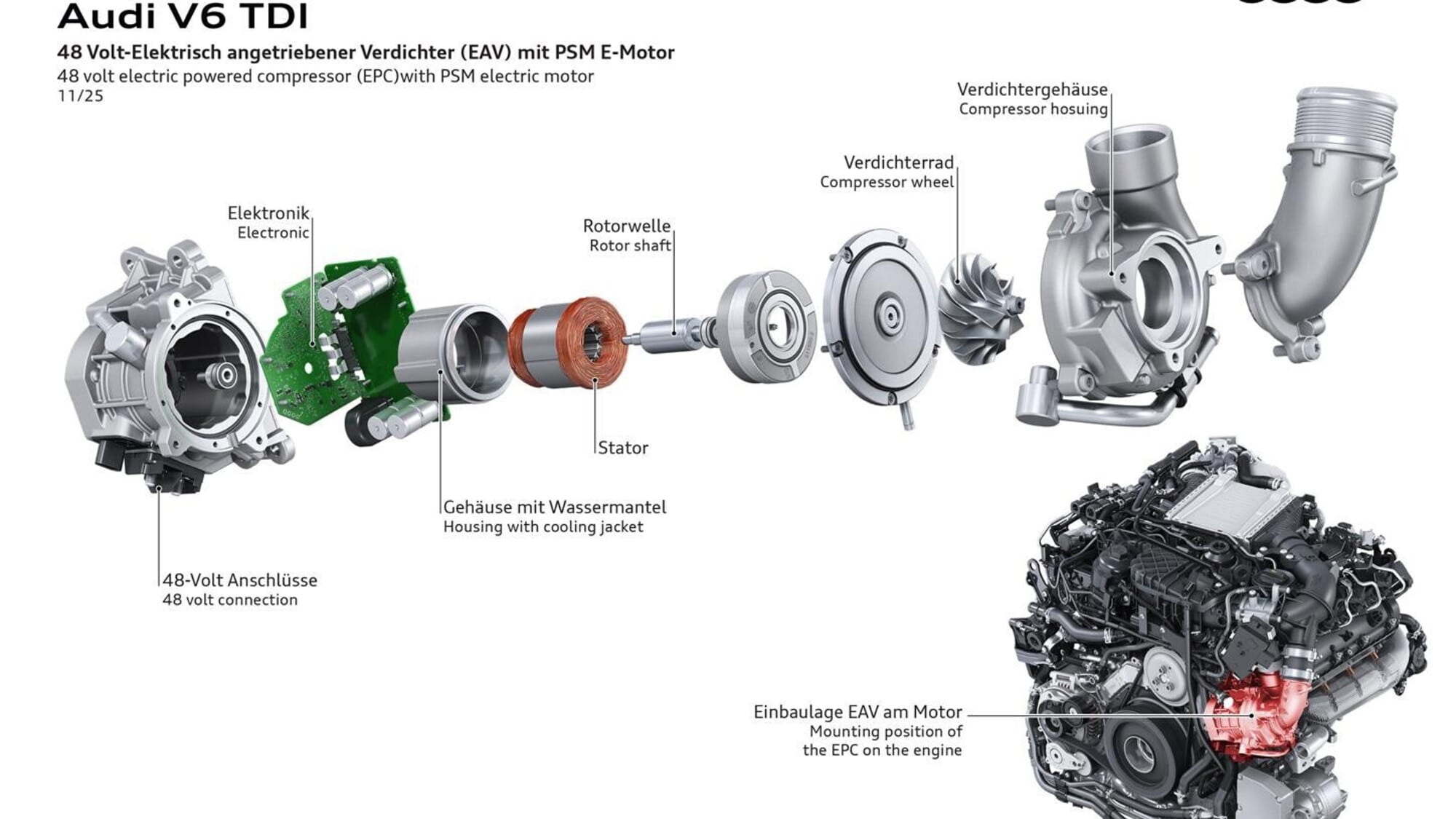 Fin qui le caratteristiche “green” del V6 3 litri Tdi alimentato a HVO 100. Poi vi sono le novità legate all’elettrificazione, che partono dal mild hybrid sul cambio automatico, in grado di muovere l’auto in avvio e nelle richieste di bassa potenza. Immediatamente successivo è l’intervento del turbo elettrico, posto a valle del turbocompressore a gas di scarico e dell’intercooler. La pressione di sovralimentazione generata dal turbo elettrico, mediante un vero e proprio motorino a 48 volt - composto da rotore e statore -, permette di azzerare il turbo lag e, rispetto alla precedente generazione il suo impiego è previsto sull’intero arco di giri motore. È stata migliorata anche la massima pressione di sovralimentazione ottenibile. Si tratta di un turbocompressore che opera per garantire la prontezza di risposta del motore, vista la capacità di raggiungere in soli 2 decimi e mezzo di secondo i 90 mila giri di rotazione del compressore.