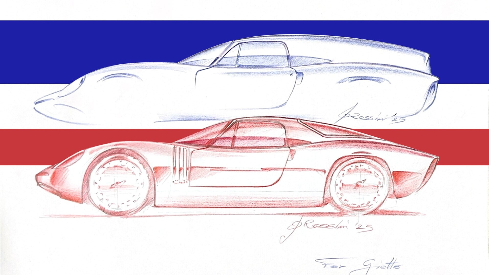Il team ErreErre ha potuto ricostruire un’idea rimasta incompiuta grazie al supporto dell’ex collaboratore e designer Fabrizio Rossini, oggi parte della struttura interna della Casa. I materiali storici hanno permesso di delineare una variante della 5300 GT con coda rialzata di ispirazione Breadvan. Da questo spunto è nata ForGiotto, che conserva l’identità frontale della GT, mentre ridefinisce proporzioni e superfici posteriori per integrare una coda tronca guidata da un lunotto verticale.