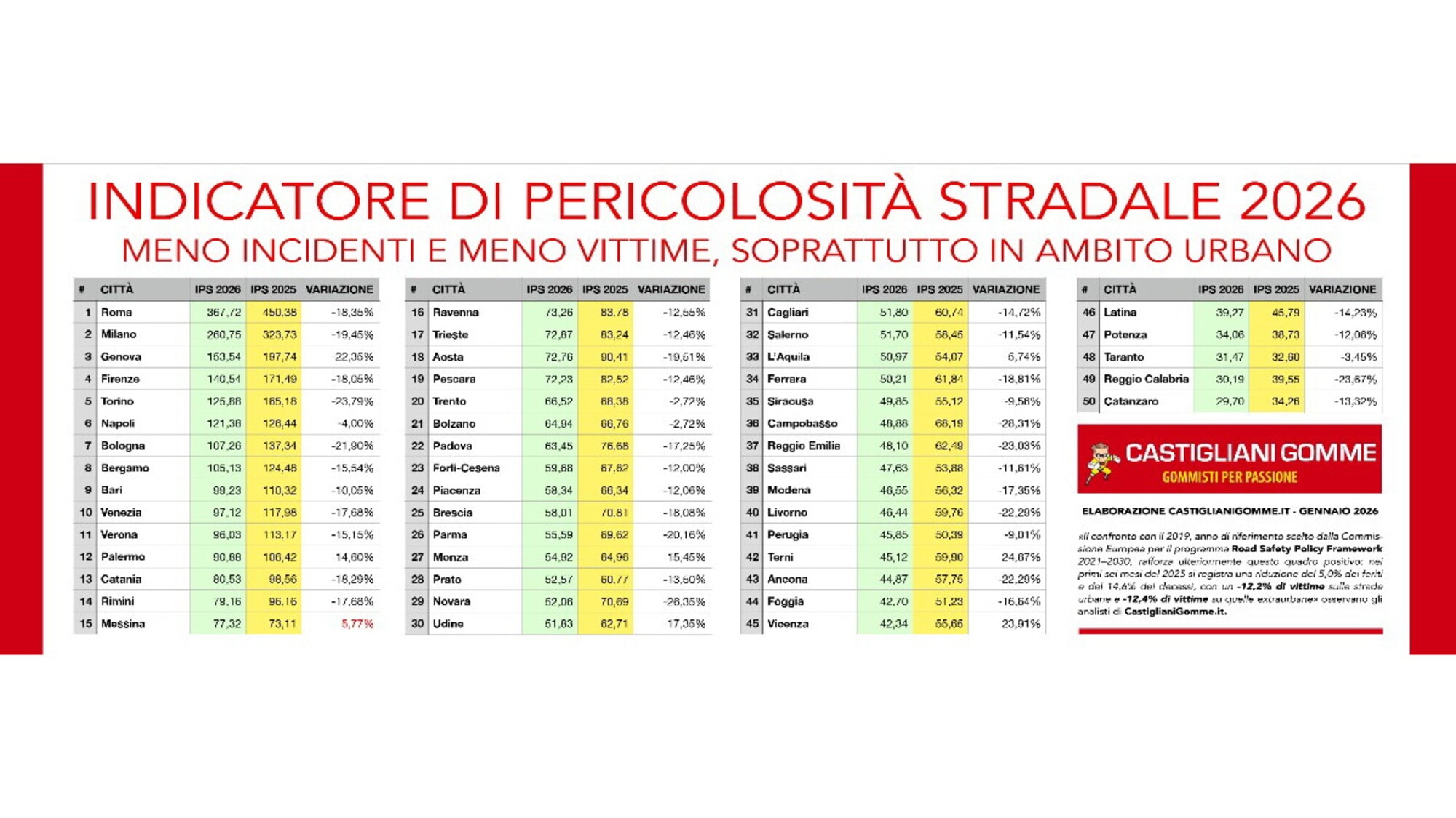 Roma continua a detenere un primato poco invidiabile. Anche nel 2026 la Capitale si conferma, infatti, la città italiana con il più alto livello di criticità legato allo stato delle strade, nonostante un miglioramento rispetto all’anno precedente. A certificarlo è l’aggiornamento dell’Indicatore di Pericolosità Stradale elaborato da CastiglianiGomme.it, che fotografa una situazione in lieve evoluzione ma ancora lontana da standard accettabili, soprattutto se confrontata con le altre grandi aree urbane del Paese.